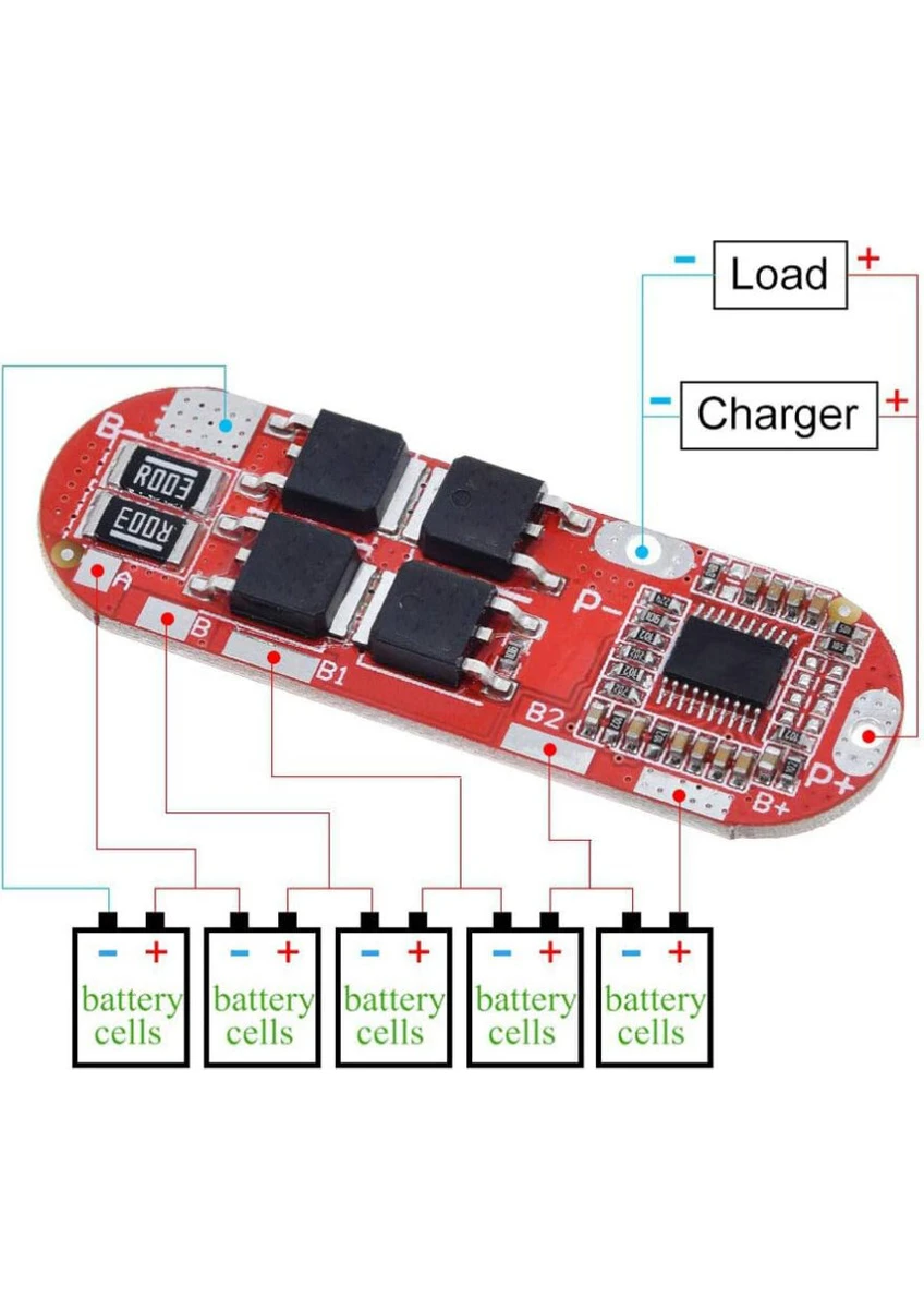 5S 25A Li-Ion BMS Batarya Koruma Kartı, 5 seri bağlı lityum iyon (Li-ion) pil grupları için tasarlanmış güvenilir bir batarya koruma devresidir. Bu modül, pil paketlerinizi aşırı şarj, aşırı deşarj, kısa devre ve aşırı akım gibi risklere karşı koruyarak güvenli kullanım sağlar.